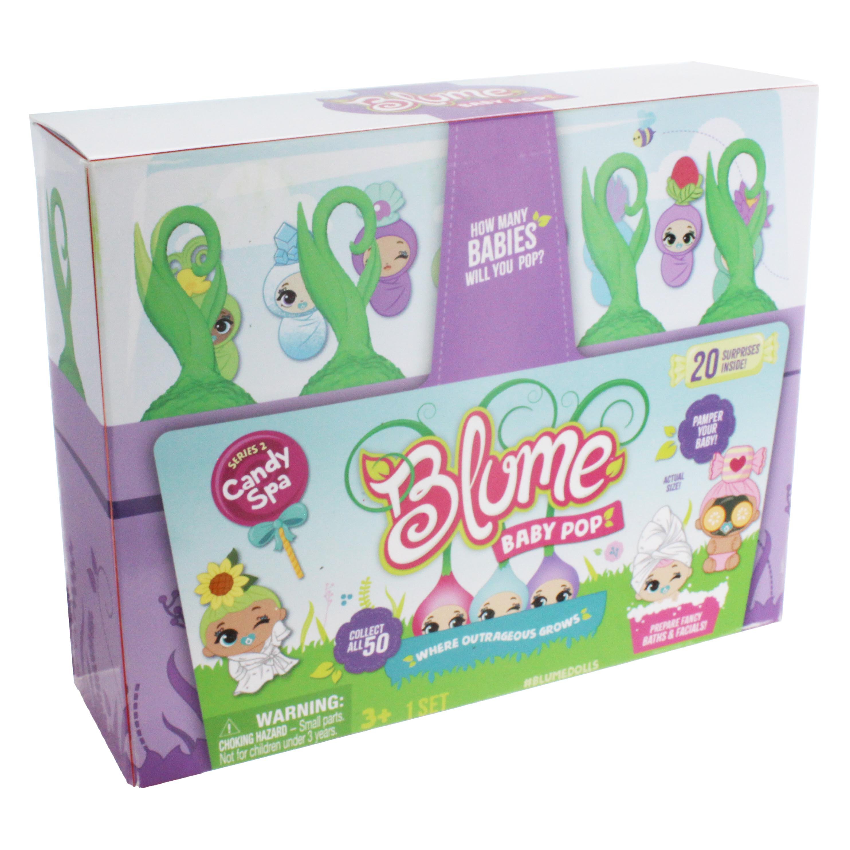 Outrageously cute Blume babies are ready to be discovered. With Baby Pop the surprises dont stop as hidden under every sprout is either a sweet candy-scented baby or a cute baby accessoryjust pull and POP to reveal whats inside. Each of the Blume babies comes wrapped in a removable swaddle and have totally unique hairstyles.